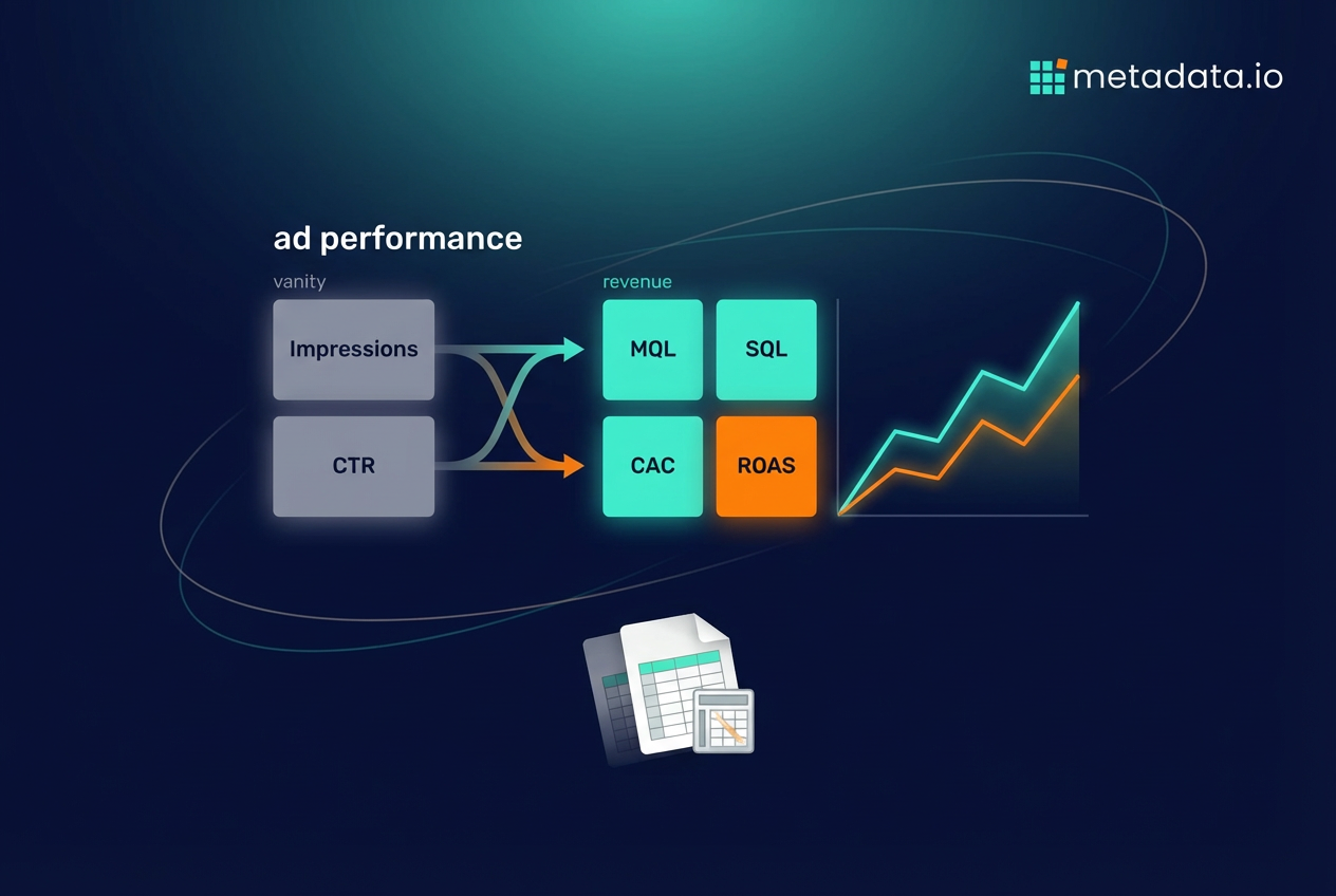 Most B2B marketers are drowning in ad metrics that don’t matter while the numbers that actually connect to revenue get ignored. This guide breaks down which ad performance metrics you should track, how to improve them without burning out on manual work, and why most teams are wasting 70% of their time on spreadsheets instead of strategy.